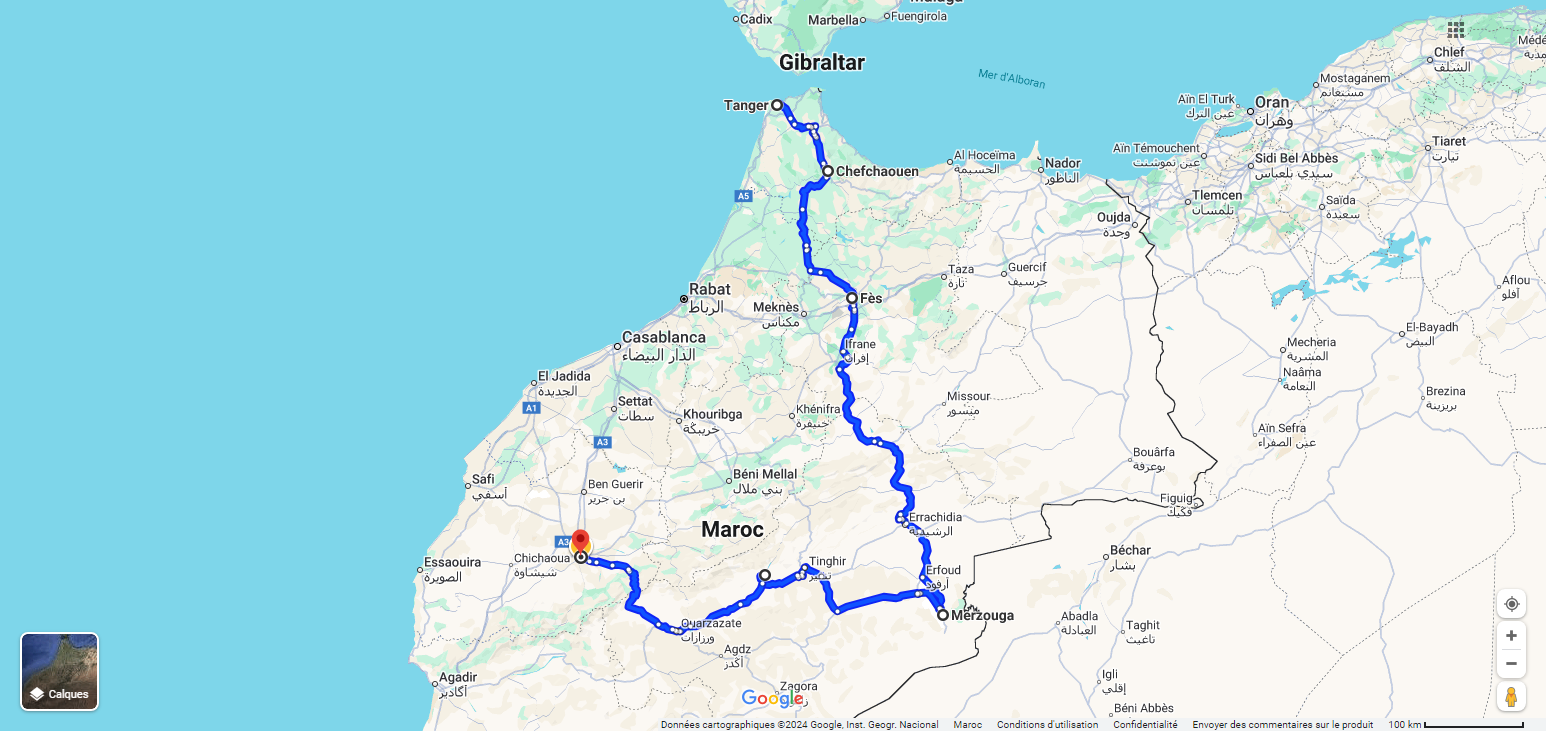 The tour starts in Tangier city, and ends in Marrakech city.